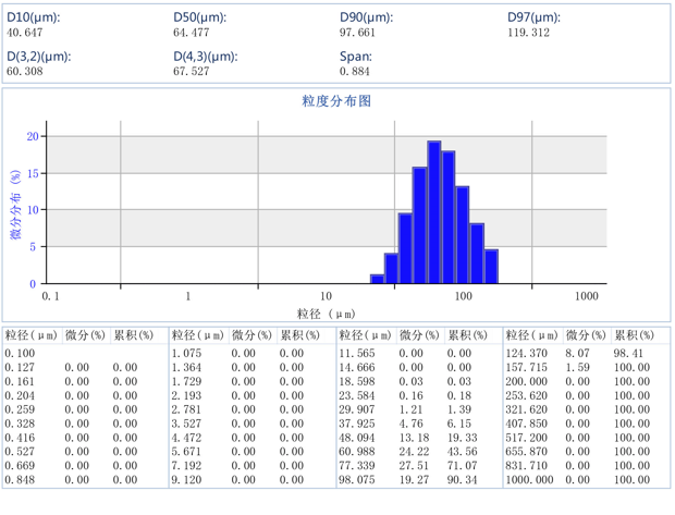 1. 白剛玉W60的標(biāo)準(zhǔn)規(guī)格是W63,60-63微米,對應(yīng)日標(biāo)#280白剛玉,其D50中值為63-64微米。它的篩分方式是經(jīng)過水洗溢流或虹吸法生產(chǎn)的,雜質(zhì)少,流動性好。粒度分布如下圖: