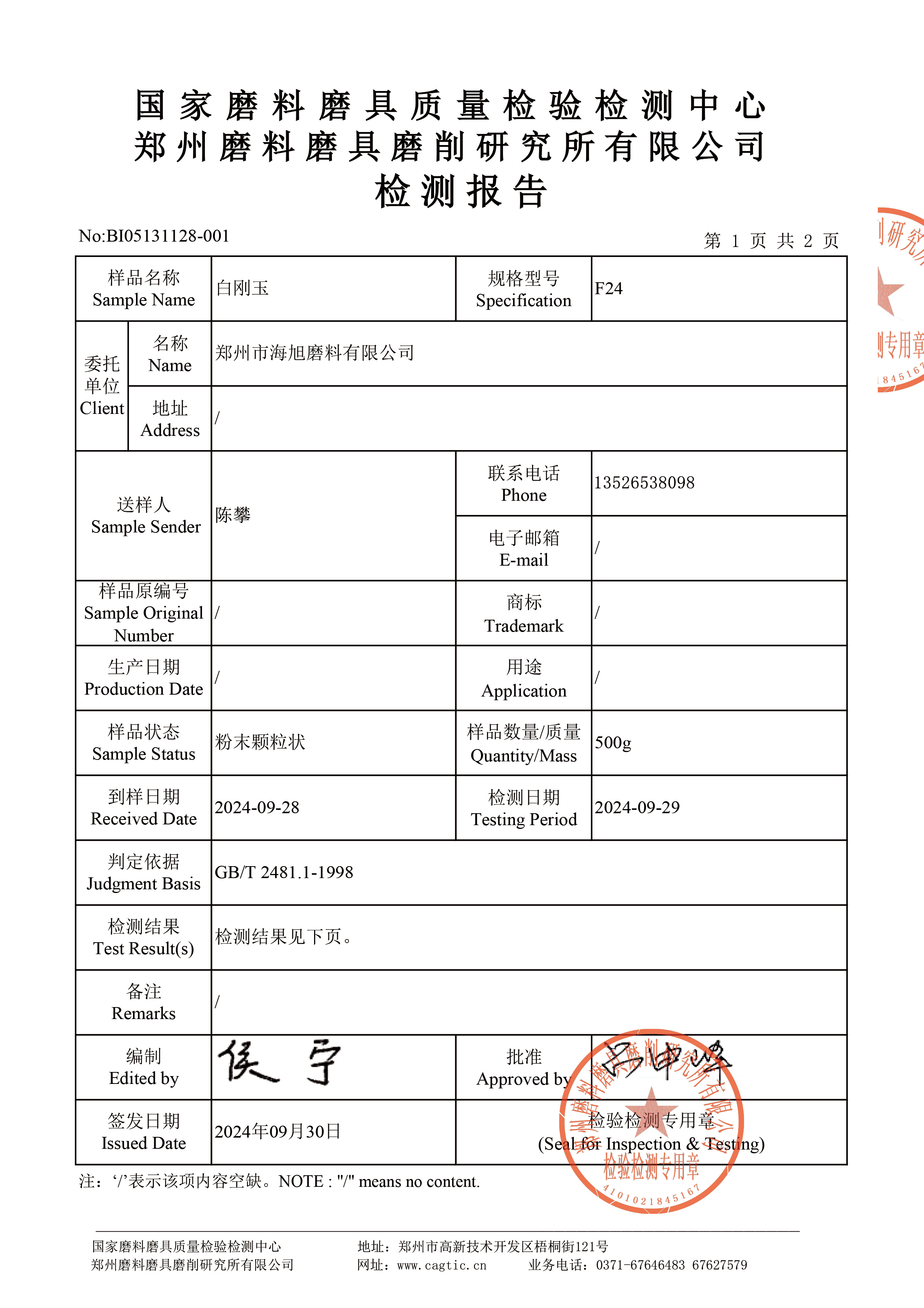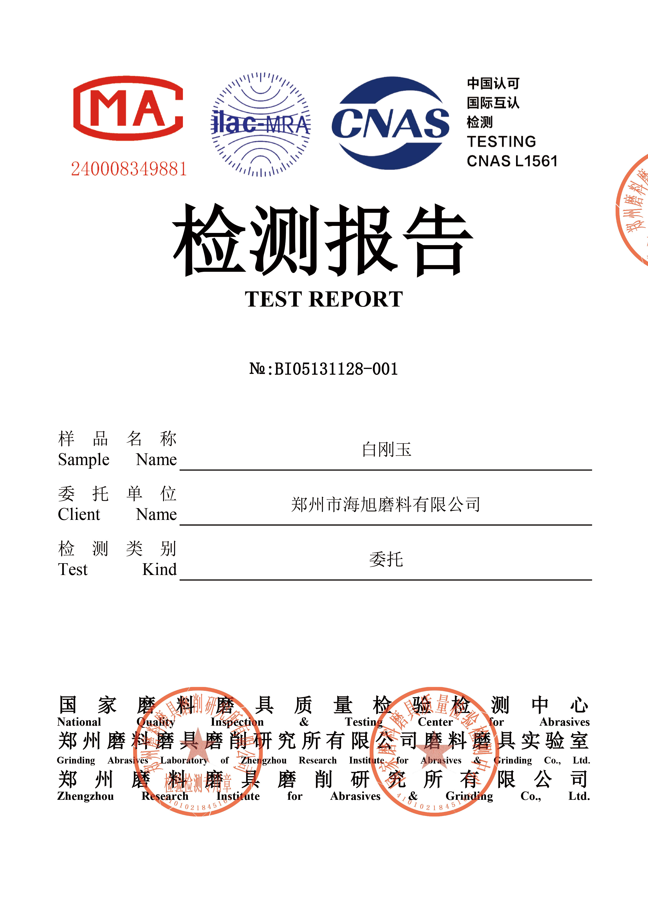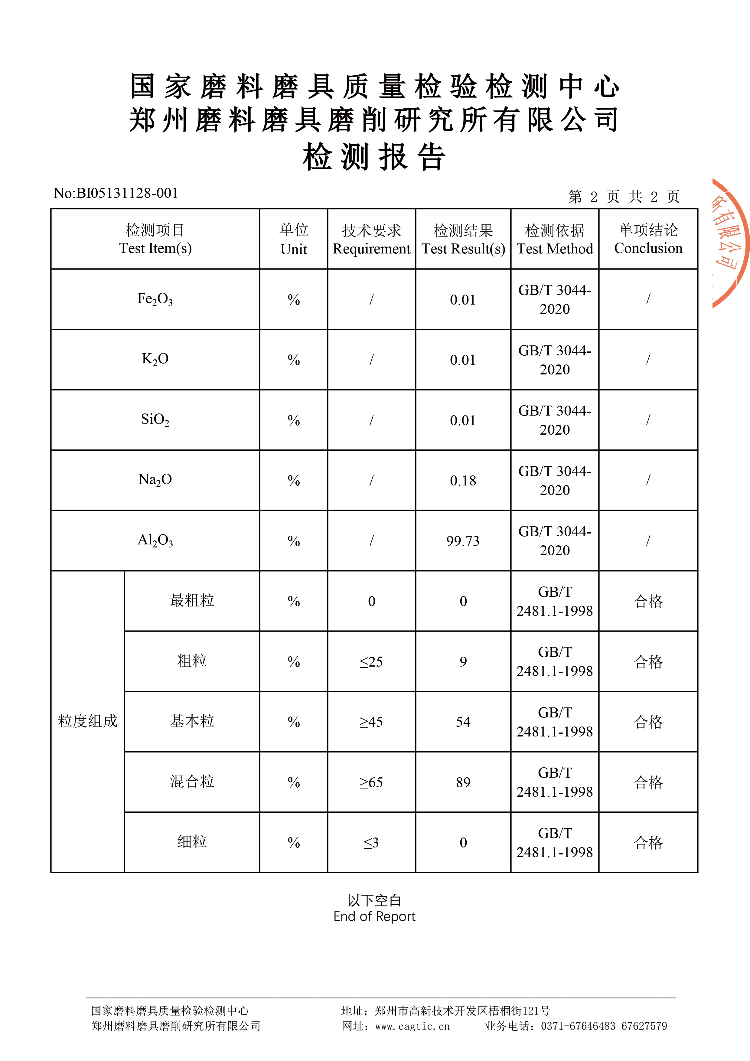 WFA磨料白剛玉F24目三磨所檢測結(jié)果